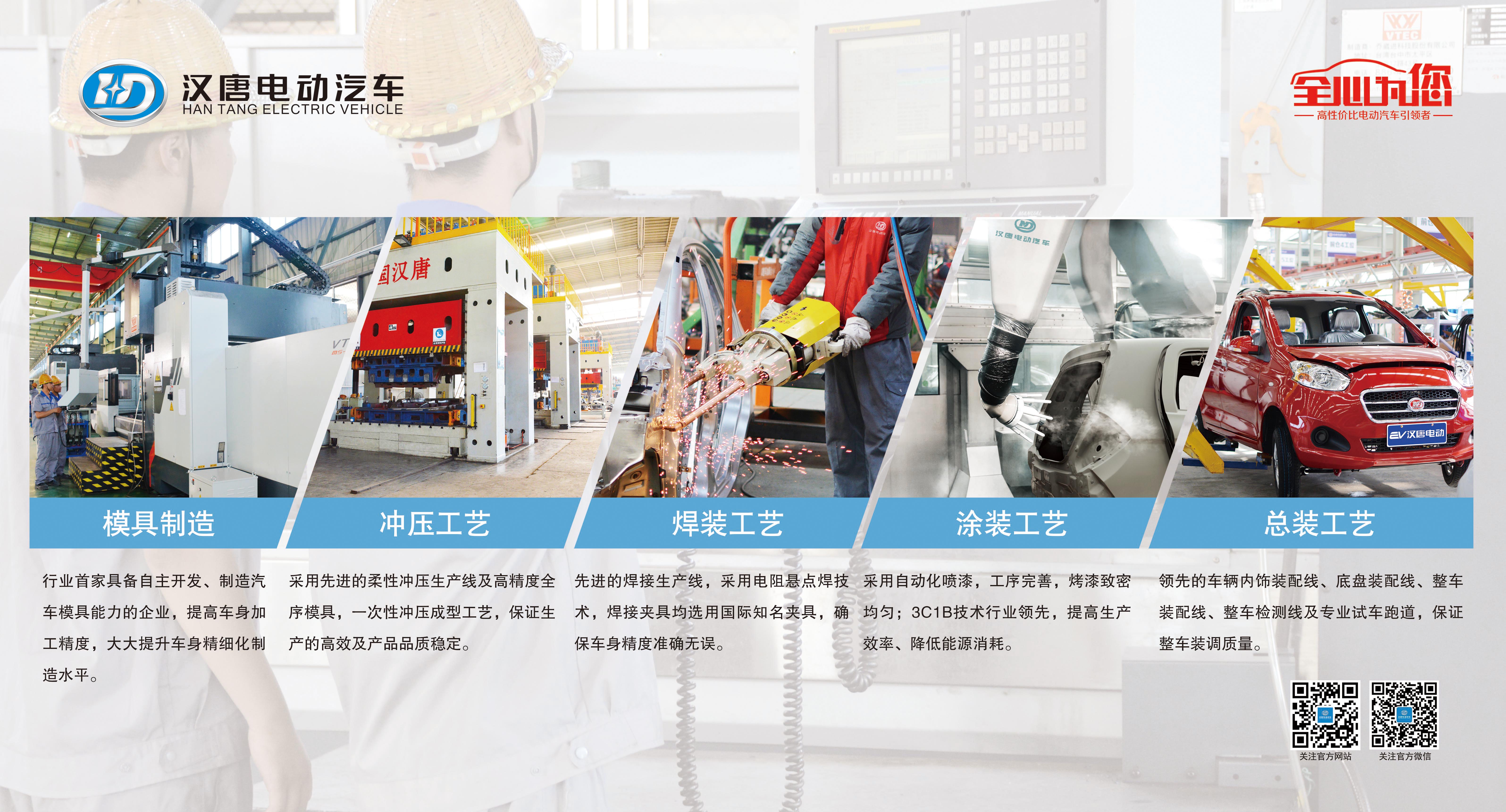 核心制造技術對產品質量的的重要性不言而喻,漢唐電動汽車掌握五大汽車核心制造工藝,憑借自主擁有的研發制造生產能力為漢唐產品保駕護航。作為在行業內迅速馭勢崛起的電動汽車品牌,漢唐電動汽車擁有雄厚的產品研發能力、制造實力,以制造高質量的產品為發展核心,利用掌握的模具、沖壓、焊裝、涂裝、總裝五大汽車核心制造工藝,為漢唐產品的高質量奠定了技術基礎。