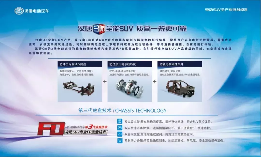 有漢唐SUV研發中心的“內驅動”支撐,又有千畝產業園高標準“智慧化”生產,依托行業領先的模具、沖壓、焊接、涂裝、總裝五大汽車核心技術制造工藝。率先開創低速電動汽車第三代底盤(FD底盤技術)技術創新,打造出三防全能SUV——漢唐Q5新車型,真正做到了引領電動SUV核心技術發展,推動低速電動汽車行業整體技術升級。